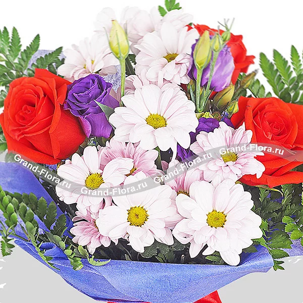 Уменьшенный: роза красная - 3 шт., хризантема кустовая  светло фиолетовая - 1 шт., эустома фиолетовая - 1 шт., папоротник - 3 шт, фетр синий, бант красный.