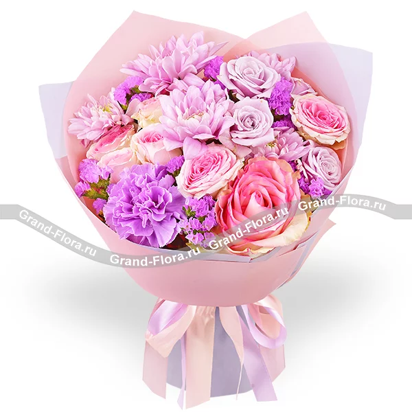 Букет выполнен из роз нежно – розовых и фиолетовых оттенков, кустовой хризантемы сиреневого оттенка и гвоздики в тон композиции, финальные аккорды статицы, в окружении невесомого розово – фиолетового фетра и ленты, завершают букет, делая его изысканным и элегантным. Букет составляет от 30см в высоту, а диаметр от 20см до 35см, в зависимости от выбранного Вами варианта. Обращаем Ваше внимание, что состав и оформление букета могут отличаться.