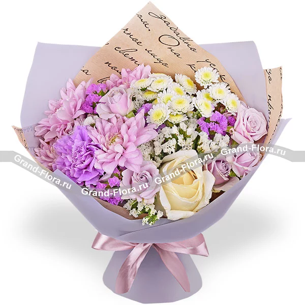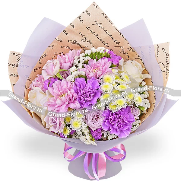 Стандартный: роза белая - 2 шт., роза кустовая фиолетовая - 1 шт., гвоздика фиолетовая - 2 шт., хризантема сантини - 2 шт., хризантема кустовая ромашковая фиолетовая - 2 шт., статица, упаковка, лента. Примерный размер: 30Х30 см.