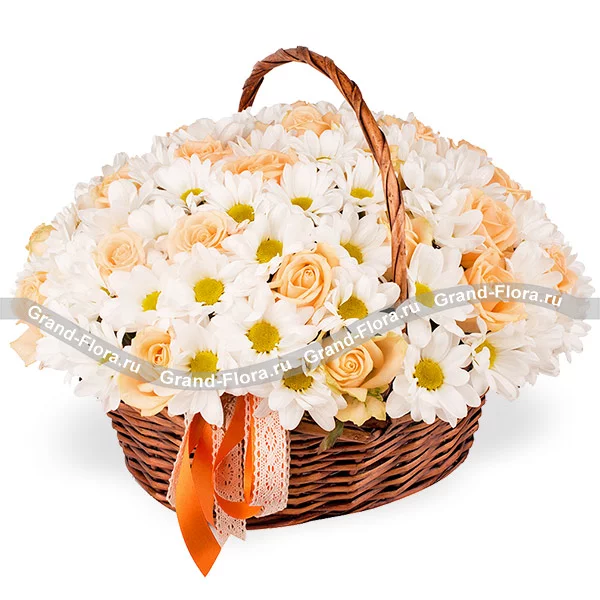 Стандартный: хризантема белая ромашковидная - 8 шт., роза кремовая - 5 шт., оазис, корзина.